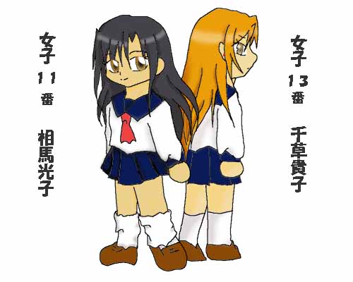 3頭身くらいで描こうと思ったら5頭身くらいになっちゃった。 最初は、光子だけだったけど、なんか寂しいから貴子も入れてみた。 光子と貴子の組み合わせは、好きだからまた描きたいな。